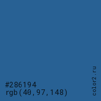 Цвет #286194 в цветовой модели RGB обозначается тремя октетами (40, 97, 148) в десятичном формате и #286194 в шестнадцатиричном (hex) формате, которые являются интенсивностью красного 40 (hex 28), интенсивность зелёного 97 (hex 61) и интенсивность синего 148 (hex 94).