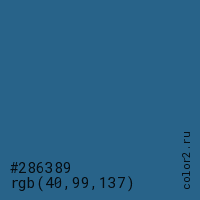 Цвет #286389 в цветовой модели RGB обозначается тремя октетами (40, 99, 137) в десятичном формате и #286389 в шестнадцатиричном (hex) формате, которые являются интенсивностью красного 40 (hex 28), интенсивность зелёного 99 (hex 63) и интенсивность синего 137 (hex 89).