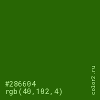 Цвет #286604 в цветовой модели RGB обозначается тремя октетами (40, 102, 4) в десятичном формате и #286604 в шестнадцатиричном (hex) формате, которые являются интенсивностью красного 40 (hex 28), интенсивность зелёного 102 (hex 66) и интенсивность синего 4 (hex 04).