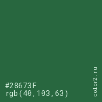 Цвет #28673F в цветовой модели RGB обозначается тремя октетами (40, 103, 63) в десятичном формате и #28673F в шестнадцатиричном (hex) формате, которые являются интенсивностью красного 40 (hex 28), интенсивность зелёного 103 (hex 67) и интенсивность синего 63 (hex 3F).
