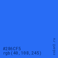 Цвет #286CF5 в цветовой модели RGB обозначается тремя октетами (40, 108, 245) в десятичном формате и #286CF5 в шестнадцатиричном (hex) формате, которые являются интенсивностью красного 40 (hex 28), интенсивность зелёного 108 (hex 6C) и интенсивность синего 245 (hex F5).