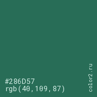 Цвет #286D57 в цветовой модели RGB обозначается тремя октетами (40, 109, 87) в десятичном формате и #286D57 в шестнадцатиричном (hex) формате, которые являются интенсивностью красного 40 (hex 28), интенсивность зелёного 109 (hex 6D) и интенсивность синего 87 (hex 57).