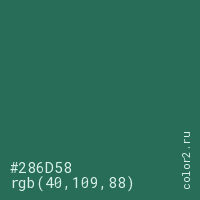 Цвет #286D58 в цветовой модели RGB обозначается тремя октетами (40, 109, 88) в десятичном формате и #286D58 в шестнадцатиричном (hex) формате, которые являются интенсивностью красного 40 (hex 28), интенсивность зелёного 109 (hex 6D) и интенсивность синего 88 (hex 58).