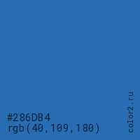 Цвет #286DB4 в цветовой модели RGB обозначается тремя октетами (40, 109, 180) в десятичном формате и #286DB4 в шестнадцатиричном (hex) формате, которые являются интенсивностью красного 40 (hex 28), интенсивность зелёного 109 (hex 6D) и интенсивность синего 180 (hex B4).