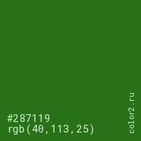 Цвет #287119 в цветовой модели RGB обозначается тремя октетами (40, 113, 25) в десятичном формате и #287119 в шестнадцатиричном (hex) формате, которые являются интенсивностью красного 40 (hex 28), интенсивность зелёного 113 (hex 71) и интенсивность синего 25 (hex 19).
