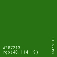 Цвет #287213 в цветовой модели RGB обозначается тремя октетами (40, 114, 19) в десятичном формате и #287213 в шестнадцатиричном (hex) формате, которые являются интенсивностью красного 40 (hex 28), интенсивность зелёного 114 (hex 72) и интенсивность синего 19 (hex 13).