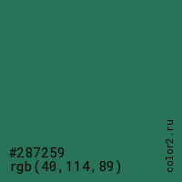 Цвет #287259 в цветовой модели RGB обозначается тремя октетами (40, 114, 89) в десятичном формате и #287259 в шестнадцатиричном (hex) формате, которые являются интенсивностью красного 40 (hex 28), интенсивность зелёного 114 (hex 72) и интенсивность синего 89 (hex 59).