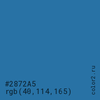 Цвет #2872A5 в цветовой модели RGB обозначается тремя октетами (40, 114, 165) в десятичном формате и #2872A5 в шестнадцатиричном (hex) формате, которые являются интенсивностью красного 40 (hex 28), интенсивность зелёного 114 (hex 72) и интенсивность синего 165 (hex A5).