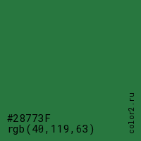Цвет #28773F в цветовой модели RGB обозначается тремя октетами (40, 119, 63) в десятичном формате и #28773F в шестнадцатиричном (hex) формате, которые являются интенсивностью красного 40 (hex 28), интенсивность зелёного 119 (hex 77) и интенсивность синего 63 (hex 3F).