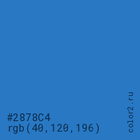 Цвет #2878C4 в цветовой модели RGB обозначается тремя октетами (40, 120, 196) в десятичном формате и #2878C4 в шестнадцатиричном (hex) формате, которые являются интенсивностью красного 40 (hex 28), интенсивность зелёного 120 (hex 78) и интенсивность синего 196 (hex C4).