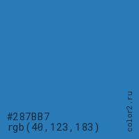 Цвет #287BB7 в цветовой модели RGB обозначается тремя октетами (40, 123, 183) в десятичном формате и #287BB7 в шестнадцатиричном (hex) формате, которые являются интенсивностью красного 40 (hex 28), интенсивность зелёного 123 (hex 7B) и интенсивность синего 183 (hex B7).