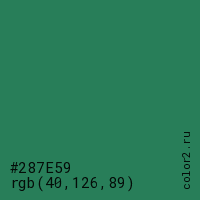 Цвет #287E59 в цветовой модели RGB обозначается тремя октетами (40, 126, 89) в десятичном формате и #287E59 в шестнадцатиричном (hex) формате, которые являются интенсивностью красного 40 (hex 28), интенсивность зелёного 126 (hex 7E) и интенсивность синего 89 (hex 59).