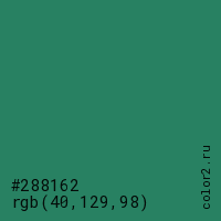 Цвет #288162 в цветовой модели RGB обозначается тремя октетами (40, 129, 98) в десятичном формате и #288162 в шестнадцатиричном (hex) формате, которые являются интенсивностью красного 40 (hex 28), интенсивность зелёного 129 (hex 81) и интенсивность синего 98 (hex 62).