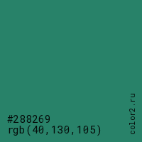 Цвет #288269 в цветовой модели RGB обозначается тремя октетами (40, 130, 105) в десятичном формате и #288269 в шестнадцатиричном (hex) формате, которые являются интенсивностью красного 40 (hex 28), интенсивность зелёного 130 (hex 82) и интенсивность синего 105 (hex 69).