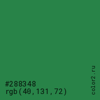 Цвет #288348 в цветовой модели RGB обозначается тремя октетами (40, 131, 72) в десятичном формате и #288348 в шестнадцатиричном (hex) формате, которые являются интенсивностью красного 40 (hex 28), интенсивность зелёного 131 (hex 83) и интенсивность синего 72 (hex 48).