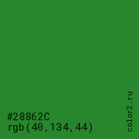 Цвет #28862C в цветовой модели RGB обозначается тремя октетами (40, 134, 44) в десятичном формате и #28862C в шестнадцатиричном (hex) формате, которые являются интенсивностью красного 40 (hex 28), интенсивность зелёного 134 (hex 86) и интенсивность синего 44 (hex 2C).