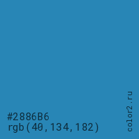 Цвет #2886B6 в цветовой модели RGB обозначается тремя октетами (40, 134, 182) в десятичном формате и #2886B6 в шестнадцатиричном (hex) формате, которые являются интенсивностью красного 40 (hex 28), интенсивность зелёного 134 (hex 86) и интенсивность синего 182 (hex B6).