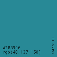 Цвет #288996 в цветовой модели RGB обозначается тремя октетами (40, 137, 150) в десятичном формате и #288996 в шестнадцатиричном (hex) формате, которые являются интенсивностью красного 40 (hex 28), интенсивность зелёного 137 (hex 89) и интенсивность синего 150 (hex 96).