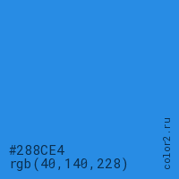 Цвет #288CE4 в цветовой модели RGB обозначается тремя октетами (40, 140, 228) в десятичном формате и #288CE4 в шестнадцатиричном (hex) формате, которые являются интенсивностью красного 40 (hex 28), интенсивность зелёного 140 (hex 8C) и интенсивность синего 228 (hex E4).