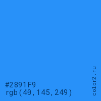 Цвет #2891F9 в цветовой модели RGB обозначается тремя октетами (40, 145, 249) в десятичном формате и #2891F9 в шестнадцатиричном (hex) формате, которые являются интенсивностью красного 40 (hex 28), интенсивность зелёного 145 (hex 91) и интенсивность синего 249 (hex F9).