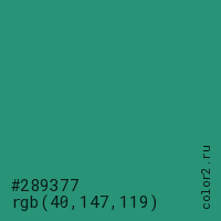 Цвет #289377 в цветовой модели RGB обозначается тремя октетами (40, 147, 119) в десятичном формате и #289377 в шестнадцатиричном (hex) формате, которые являются интенсивностью красного 40 (hex 28), интенсивность зелёного 147 (hex 93) и интенсивность синего 119 (hex 77).