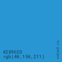 Цвет #2896D3 в цветовой модели RGB обозначается тремя октетами (40, 150, 211) в десятичном формате и #2896D3 в шестнадцатиричном (hex) формате, которые являются интенсивностью красного 40 (hex 28), интенсивность зелёного 150 (hex 96) и интенсивность синего 211 (hex D3).