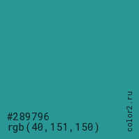 Цвет #289796 в цветовой модели RGB обозначается тремя октетами (40, 151, 150) в десятичном формате и #289796 в шестнадцатиричном (hex) формате, которые являются интенсивностью красного 40 (hex 28), интенсивность зелёного 151 (hex 97) и интенсивность синего 150 (hex 96).