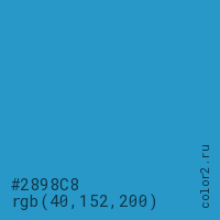 Цвет #2898C8 в цветовой модели RGB обозначается тремя октетами (40, 152, 200) в десятичном формате и #2898C8 в шестнадцатиричном (hex) формате, которые являются интенсивностью красного 40 (hex 28), интенсивность зелёного 152 (hex 98) и интенсивность синего 200 (hex C8).