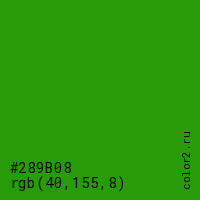 Цвет #289B08 в цветовой модели RGB обозначается тремя октетами (40, 155, 8) в десятичном формате и #289B08 в шестнадцатиричном (hex) формате, которые являются интенсивностью красного 40 (hex 28), интенсивность зелёного 155 (hex 9B) и интенсивность синего 8 (hex 08).