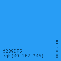Цвет #289DF5 в цветовой модели RGB обозначается тремя октетами (40, 157, 245) в десятичном формате и #289DF5 в шестнадцатиричном (hex) формате, которые являются интенсивностью красного 40 (hex 28), интенсивность зелёного 157 (hex 9D) и интенсивность синего 245 (hex F5).