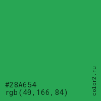 Цвет #28A654 в цветовой модели RGB обозначается тремя октетами (40, 166, 84) в десятичном формате и #28A654 в шестнадцатиричном (hex) формате, которые являются интенсивностью красного 40 (hex 28), интенсивность зелёного 166 (hex A6) и интенсивность синего 84 (hex 54).