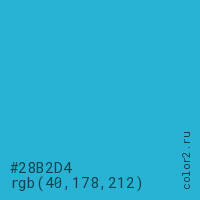 Цвет #28B2D4 в цветовой модели RGB обозначается тремя октетами (40, 178, 212) в десятичном формате и #28B2D4 в шестнадцатиричном (hex) формате, которые являются интенсивностью красного 40 (hex 28), интенсивность зелёного 178 (hex B2) и интенсивность синего 212 (hex D4).