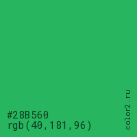 Цвет #28B560 в цветовой модели RGB обозначается тремя октетами (40, 181, 96) в десятичном формате и #28B560 в шестнадцатиричном (hex) формате, которые являются интенсивностью красного 40 (hex 28), интенсивность зелёного 181 (hex B5) и интенсивность синего 96 (hex 60).