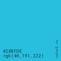 Цвет #28BFDE в цветовой модели RGB обозначается тремя октетами (40, 191, 222) в десятичном формате и #28BFDE в шестнадцатиричном (hex) формате, которые являются интенсивностью красного 40 (hex 28), интенсивность зелёного 191 (hex BF) и интенсивность синего 222 (hex DE).