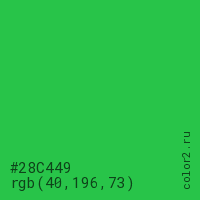 Цвет #28C449 в цветовой модели RGB обозначается тремя октетами (40, 196, 73) в десятичном формате и #28C449 в шестнадцатиричном (hex) формате, которые являются интенсивностью красного 40 (hex 28), интенсивность зелёного 196 (hex C4) и интенсивность синего 73 (hex 49).