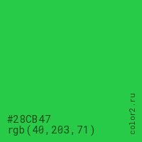 Цвет #28CB47 в цветовой модели RGB обозначается тремя октетами (40, 203, 71) в десятичном формате и #28CB47 в шестнадцатиричном (hex) формате, которые являются интенсивностью красного 40 (hex 28), интенсивность зелёного 203 (hex CB) и интенсивность синего 71 (hex 47).