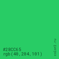 Цвет #28CC65 в цветовой модели RGB обозначается тремя октетами (40, 204, 101) в десятичном формате и #28CC65 в шестнадцатиричном (hex) формате, которые являются интенсивностью красного 40 (hex 28), интенсивность зелёного 204 (hex CC) и интенсивность синего 101 (hex 65).