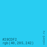 Цвет #28CDF2 в цветовой модели RGB обозначается тремя октетами (40, 205, 242) в десятичном формате и #28CDF2 в шестнадцатиричном (hex) формате, которые являются интенсивностью красного 40 (hex 28), интенсивность зелёного 205 (hex CD) и интенсивность синего 242 (hex F2).