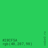 Цвет #28CF5A в цветовой модели RGB обозначается тремя октетами (40, 207, 90) в десятичном формате и #28CF5A в шестнадцатиричном (hex) формате, которые являются интенсивностью красного 40 (hex 28), интенсивность зелёного 207 (hex CF) и интенсивность синего 90 (hex 5A).