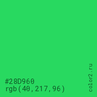 Цвет #28D960 в цветовой модели RGB обозначается тремя октетами (40, 217, 96) в десятичном формате и #28D960 в шестнадцатиричном (hex) формате, которые являются интенсивностью красного 40 (hex 28), интенсивность зелёного 217 (hex D9) и интенсивность синего 96 (hex 60).
