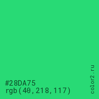 Цвет #28DA75 в цветовой модели RGB обозначается тремя октетами (40, 218, 117) в десятичном формате и #28DA75 в шестнадцатиричном (hex) формате, которые являются интенсивностью красного 40 (hex 28), интенсивность зелёного 218 (hex DA) и интенсивность синего 117 (hex 75).