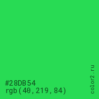 Цвет #28DB54 в цветовой модели RGB обозначается тремя октетами (40, 219, 84) в десятичном формате и #28DB54 в шестнадцатиричном (hex) формате, которые являются интенсивностью красного 40 (hex 28), интенсивность зелёного 219 (hex DB) и интенсивность синего 84 (hex 54).