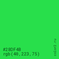 Цвет #28DF4B в цветовой модели RGB обозначается тремя октетами (40, 223, 75) в десятичном формате и #28DF4B в шестнадцатиричном (hex) формате, которые являются интенсивностью красного 40 (hex 28), интенсивность зелёного 223 (hex DF) и интенсивность синего 75 (hex 4B).