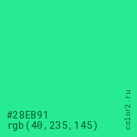 Цвет #28EB91 в цветовой модели RGB обозначается тремя октетами (40, 235, 145) в десятичном формате и #28EB91 в шестнадцатиричном (hex) формате, которые являются интенсивностью красного 40 (hex 28), интенсивность зелёного 235 (hex EB) и интенсивность синего 145 (hex 91).