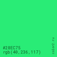 Цвет #28EC75 в цветовой модели RGB обозначается тремя октетами (40, 236, 117) в десятичном формате и #28EC75 в шестнадцатиричном (hex) формате, которые являются интенсивностью красного 40 (hex 28), интенсивность зелёного 236 (hex EC) и интенсивность синего 117 (hex 75).