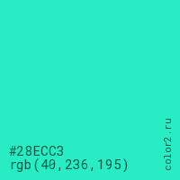 Цвет #28ECC3 в цветовой модели RGB обозначается тремя октетами (40, 236, 195) в десятичном формате и #28ECC3 в шестнадцатиричном (hex) формате, которые являются интенсивностью красного 40 (hex 28), интенсивность зелёного 236 (hex EC) и интенсивность синего 195 (hex C3).
