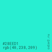 Цвет #28EED1 в цветовой модели RGB обозначается тремя октетами (40, 238, 209) в десятичном формате и #28EED1 в шестнадцатиричном (hex) формате, которые являются интенсивностью красного 40 (hex 28), интенсивность зелёного 238 (hex EE) и интенсивность синего 209 (hex D1).