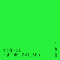 Цвет #28F13C в цветовой модели RGB обозначается тремя октетами (40, 241, 60) в десятичном формате и #28F13C в шестнадцатиричном (hex) формате, которые являются интенсивностью красного 40 (hex 28), интенсивность зелёного 241 (hex F1) и интенсивность синего 60 (hex 3C).