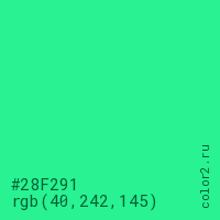Цвет #28F291 в цветовой модели RGB обозначается тремя октетами (40, 242, 145) в десятичном формате и #28F291 в шестнадцатиричном (hex) формате, которые являются интенсивностью красного 40 (hex 28), интенсивность зелёного 242 (hex F2) и интенсивность синего 145 (hex 91).