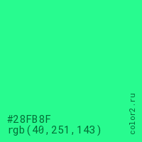 Цвет #28FB8F в цветовой модели RGB обозначается тремя октетами (40, 251, 143) в десятичном формате и #28FB8F в шестнадцатиричном (hex) формате, которые являются интенсивностью красного 40 (hex 28), интенсивность зелёного 251 (hex FB) и интенсивность синего 143 (hex 8F).